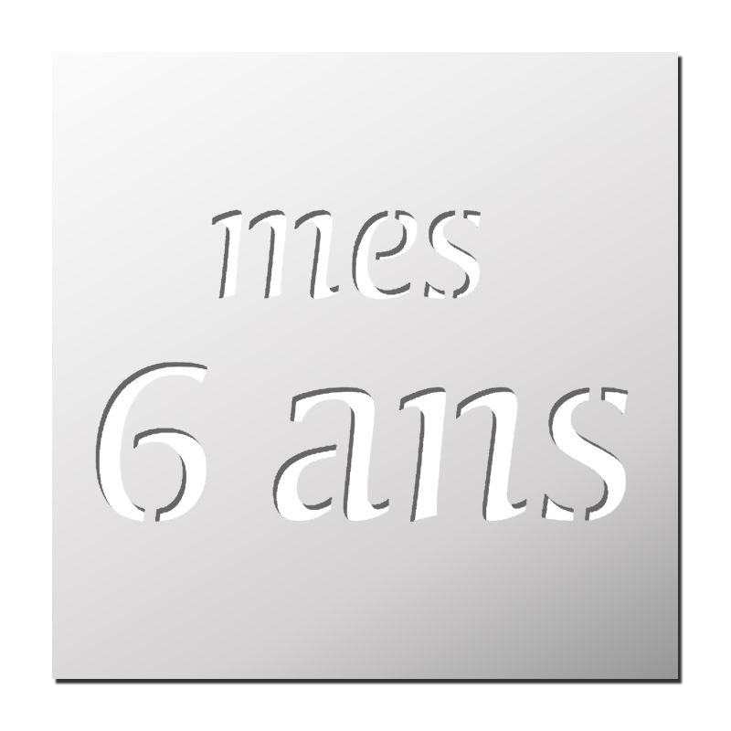 Pochoir mes 6 ans plastique réutilisable, autocollant, autocollant repositionnable ou papier. Pochoir utilisable sur tous supports (mur, tissu, toile, bois, métal, verre… ²).