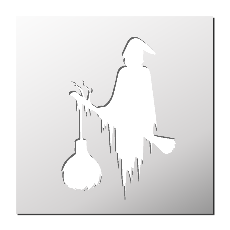 Pochoir Sorcière plastique réutilisable, autocollant, autocollant repositionnable ou papier. Pochoir utilisable sur tous supports (mur, tissu, toile, bois, métal, verre… ²).