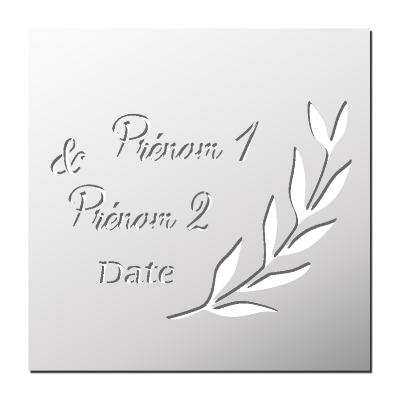Choisissez pour ce pochoir les 2 prénoms et la date que vous souhaitez, et indiquez ces informations dans le champ ci-dessous Personnalisation.