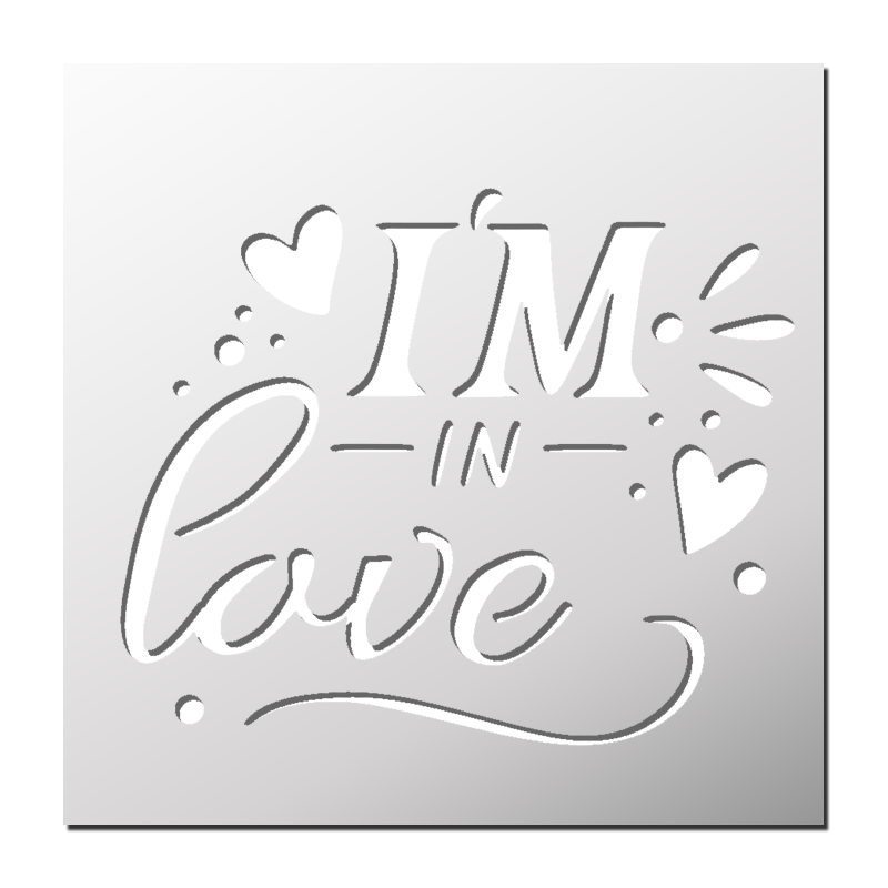 Pochoir I’m in Love plastique réutilisable, autocollant, autocollant repositionnable ou papier. Pochoir utilisable sur tous supports (mur, tissu, toile, bois, métal, verre… ²).