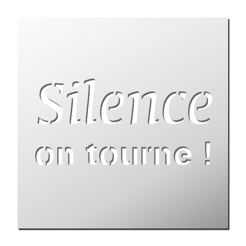 Pochoir Silence on tourne ! plastique réutilisable, autocollant, autocollant repositionnable ou papier. Pochoir utilisable sur tous supports (mur, tissu, toile, bois, métal, verre… ²).